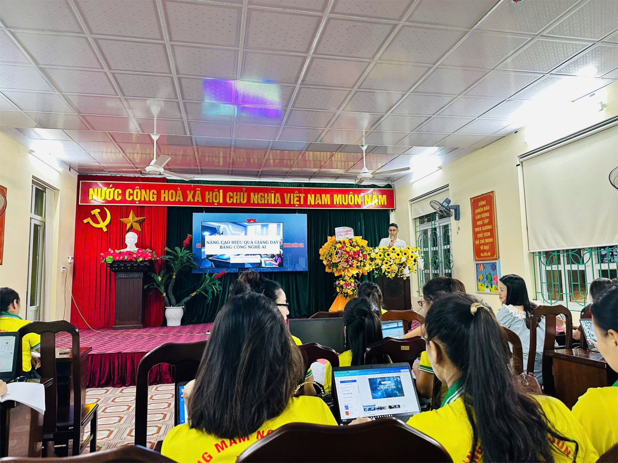 Tối ngày 09/10/2025, tập thể cán bộ, giáo viên Trường Mầm non Sơn Ca đã tham gia lớp tập huấn “Ứng dụng một số kỹ thuật AI trong công tác Giáo dục” do Tiến sĩĩ Bùi Tiến Cường – chuyên gia Trí tuệ nhân tạo, tốt nghiệp Đại học Quốc gia Seoul (Hàn Quốc) trực tiếp giảng dạy miễn phí.