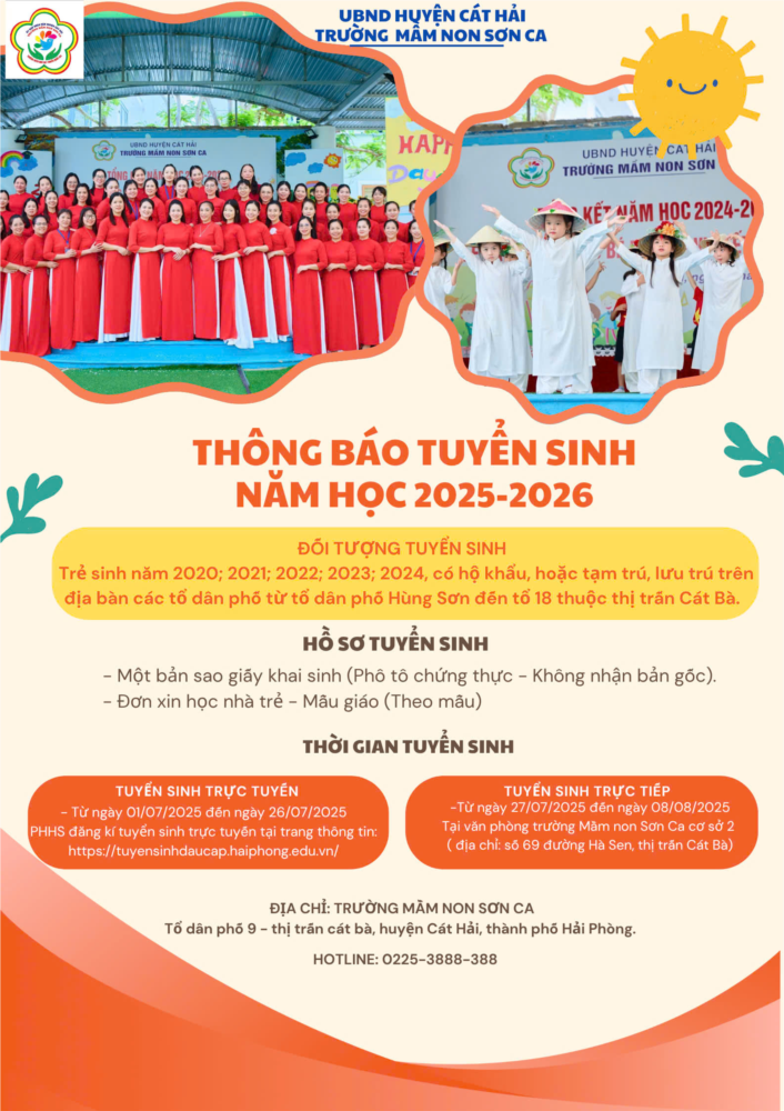 Trường mầm non Sơn Ca xin trân trọng thông báo lịch tuyển sinh năm học 2025-2026: